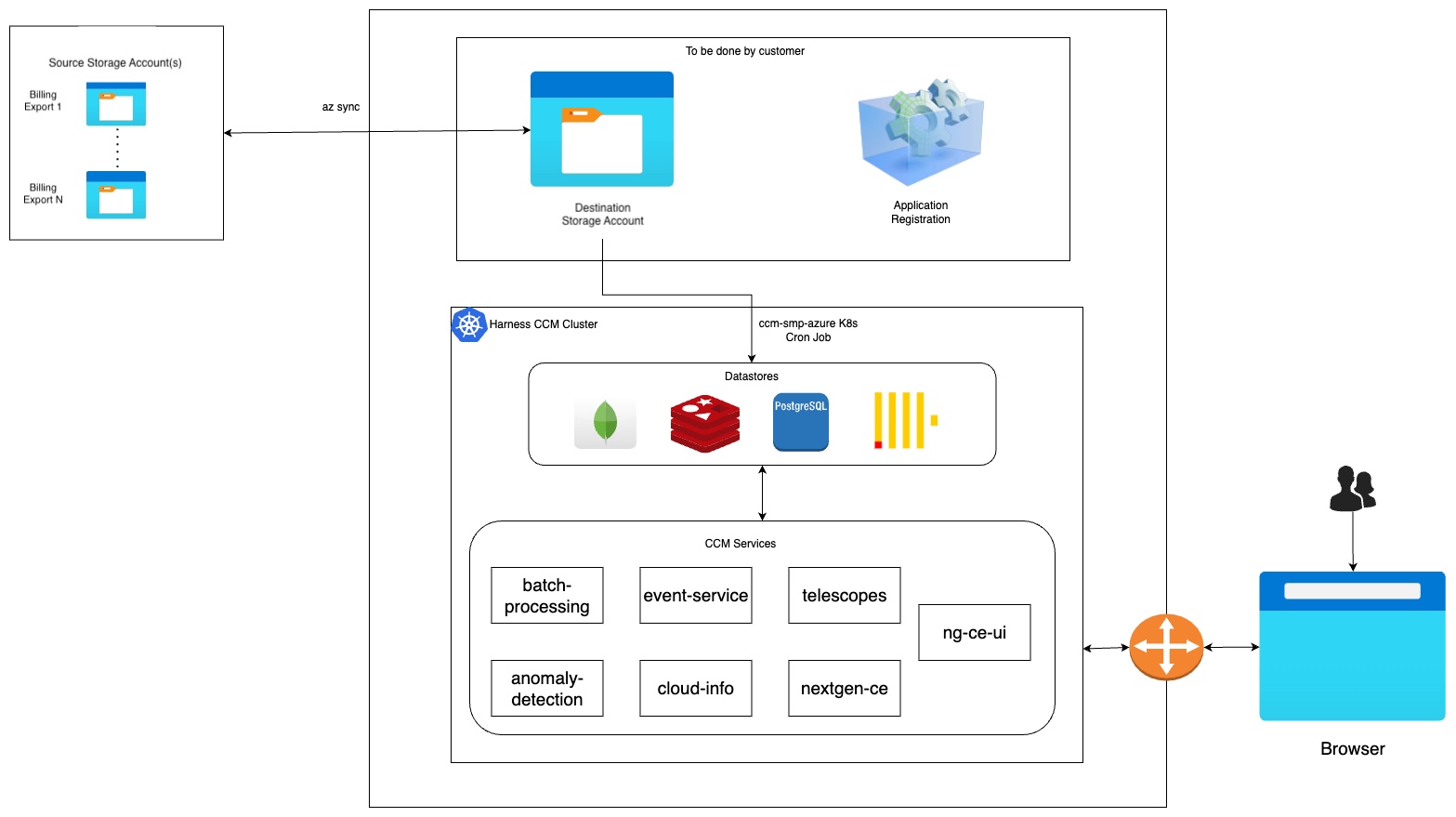 The flow at a high level works similarly to our SaaS environment. We support syncing data from multiple Azure account exports residing in different source storage accounts into CCM via a destination storage account (staging).