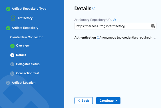 Select Continue to connect with Artifactory by using a Harness Delegate.