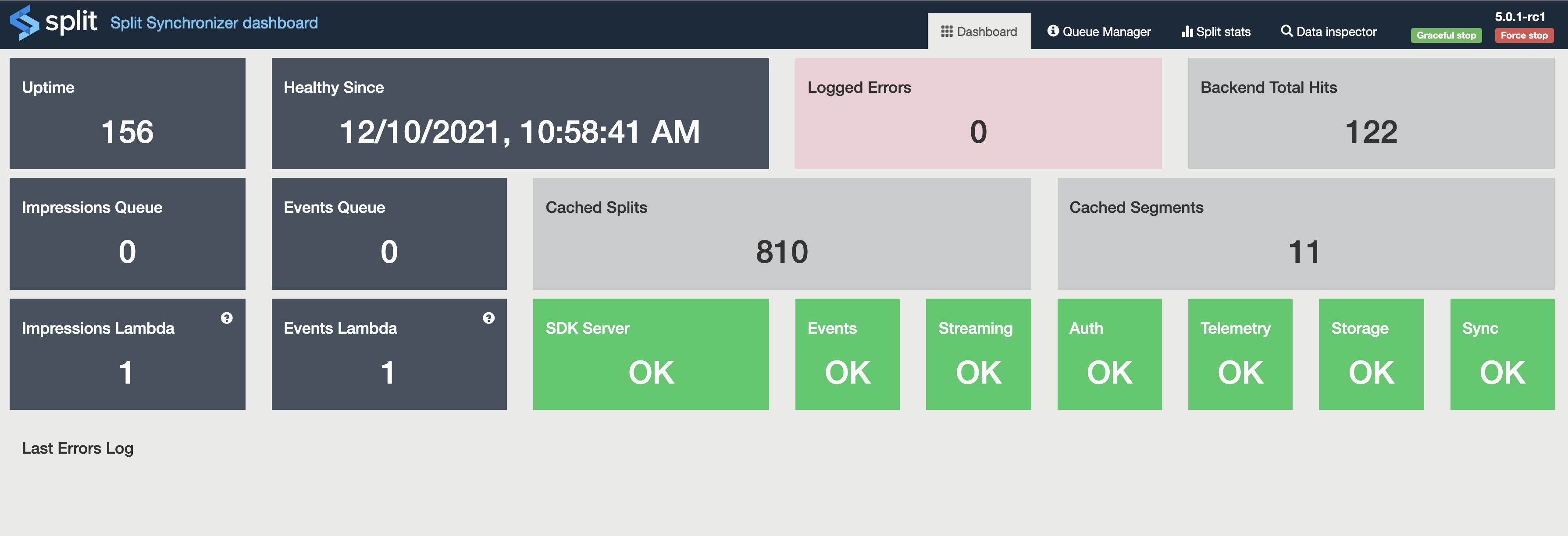 The dashboard numbers are committed every 60 seconds. The Logged Errors, Last Errors Log tiles, and the Data inspector section are populated each time the dashboard is refreshed. For Impressions and Events Queue size the numbers are refreshed every 10 seconds.
