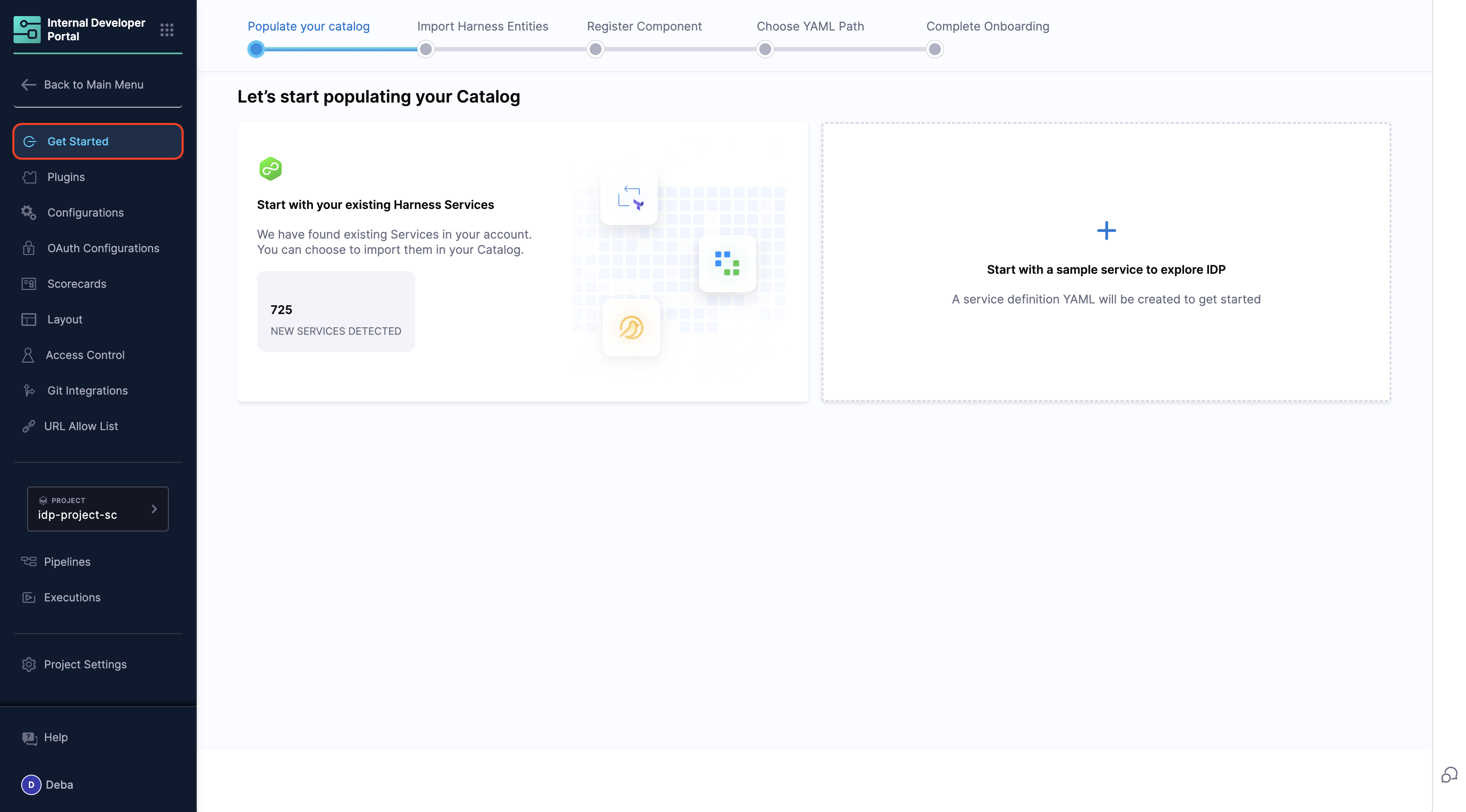 Users will now have option to onboard existing Harness services into IDP, or start with a sample service.