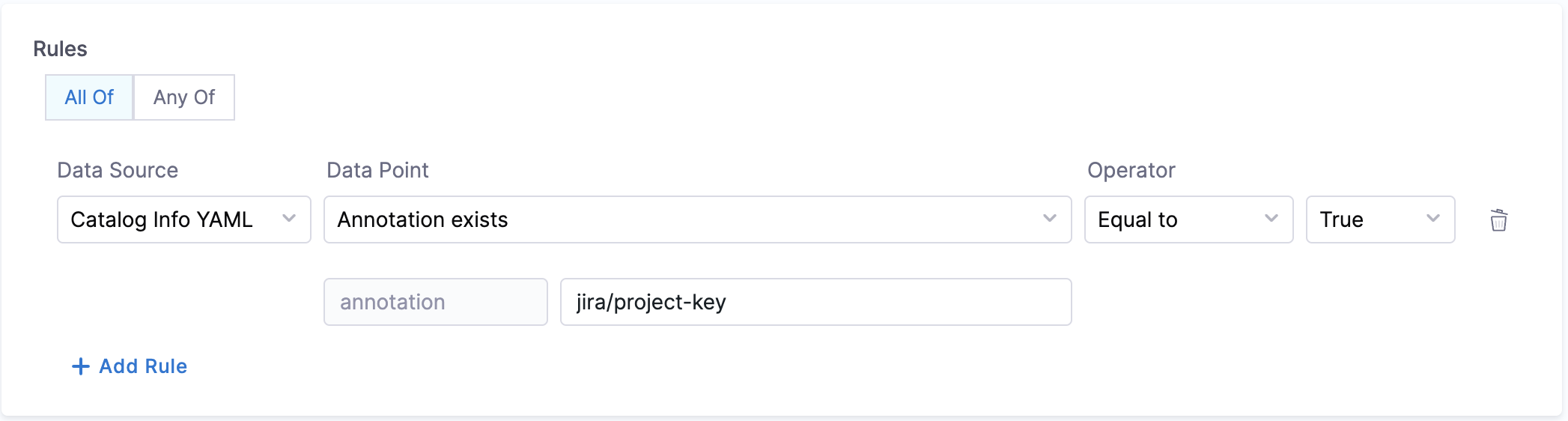 For example, setting up the check below for the example catalog-info.yaml you could find whether the annotation jira/project-keypresent or not. In this case the check would pass as the annotation is present.