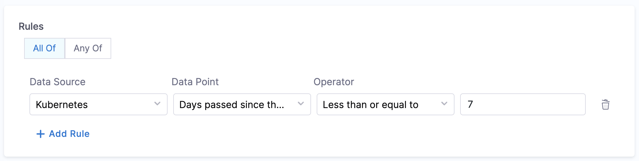 Kubernetes workloadand thelastUpdateTimeis used from the conditions section. The cluster details configured in the Kubernetes plugin are used. If more than one cluster is configured, the workload search is done in each cluster and the oldest deployment time of all is taken into consideration. - Prerequisites: The Kubernetes plugin needs to be configured and enabled in the admin section. Refer here for more details.