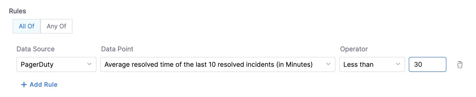 - Average resolved time of the last 10 resolved incidents (in Minutes) - This data point can be used to create rules to check if the average resolved time for the last 10 resolved incidents (in Minutes) is less than the given provided input values.