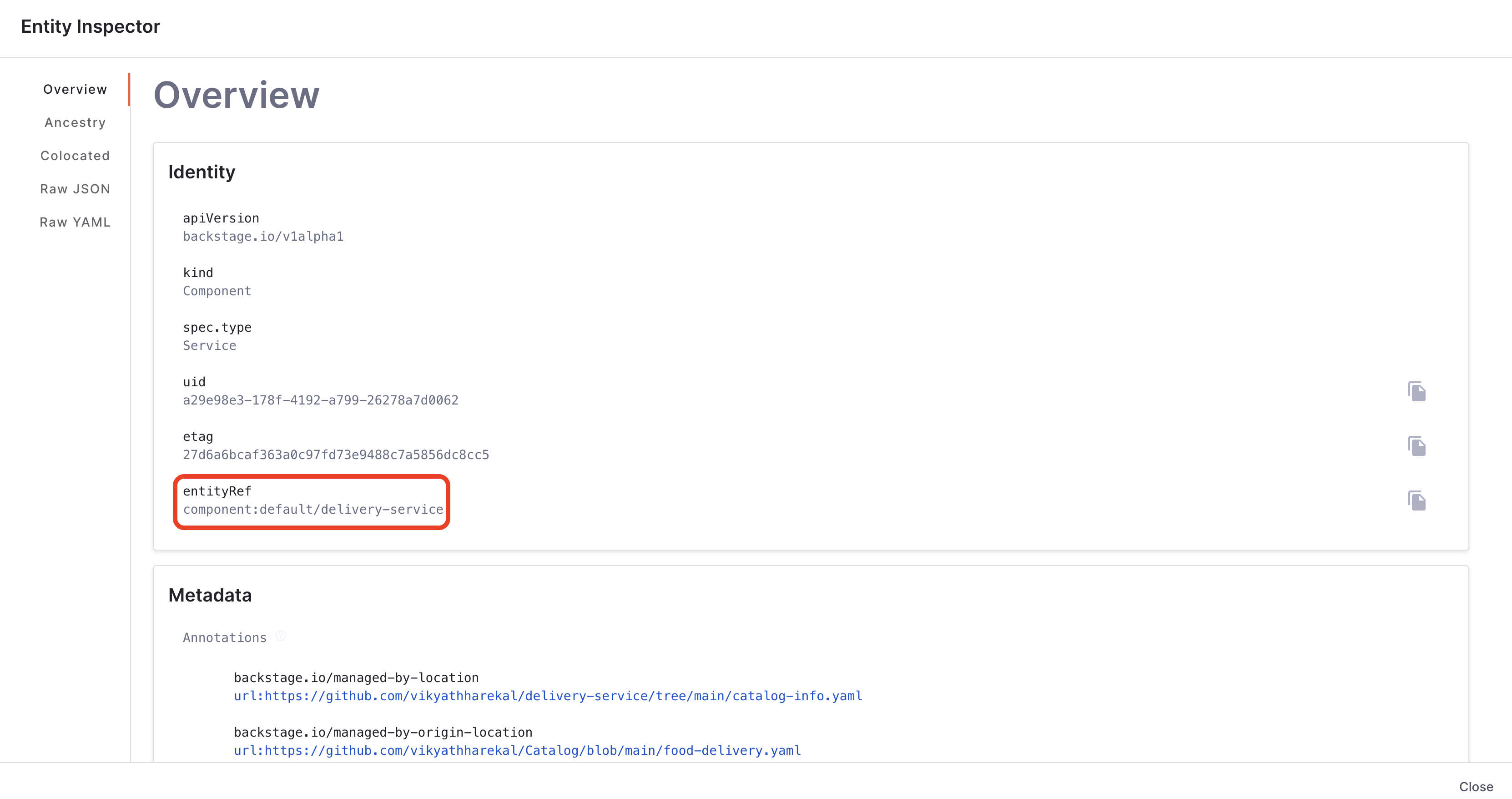 In the above body the openTicket which got created in JIRA will be added, to kind component and type service owned by the usergroup selected in the Workflows. Under entity_ref add the component link to which you want to add the ticket ID, the unique entity reference could be found using inspect entity for the component in Catalog.