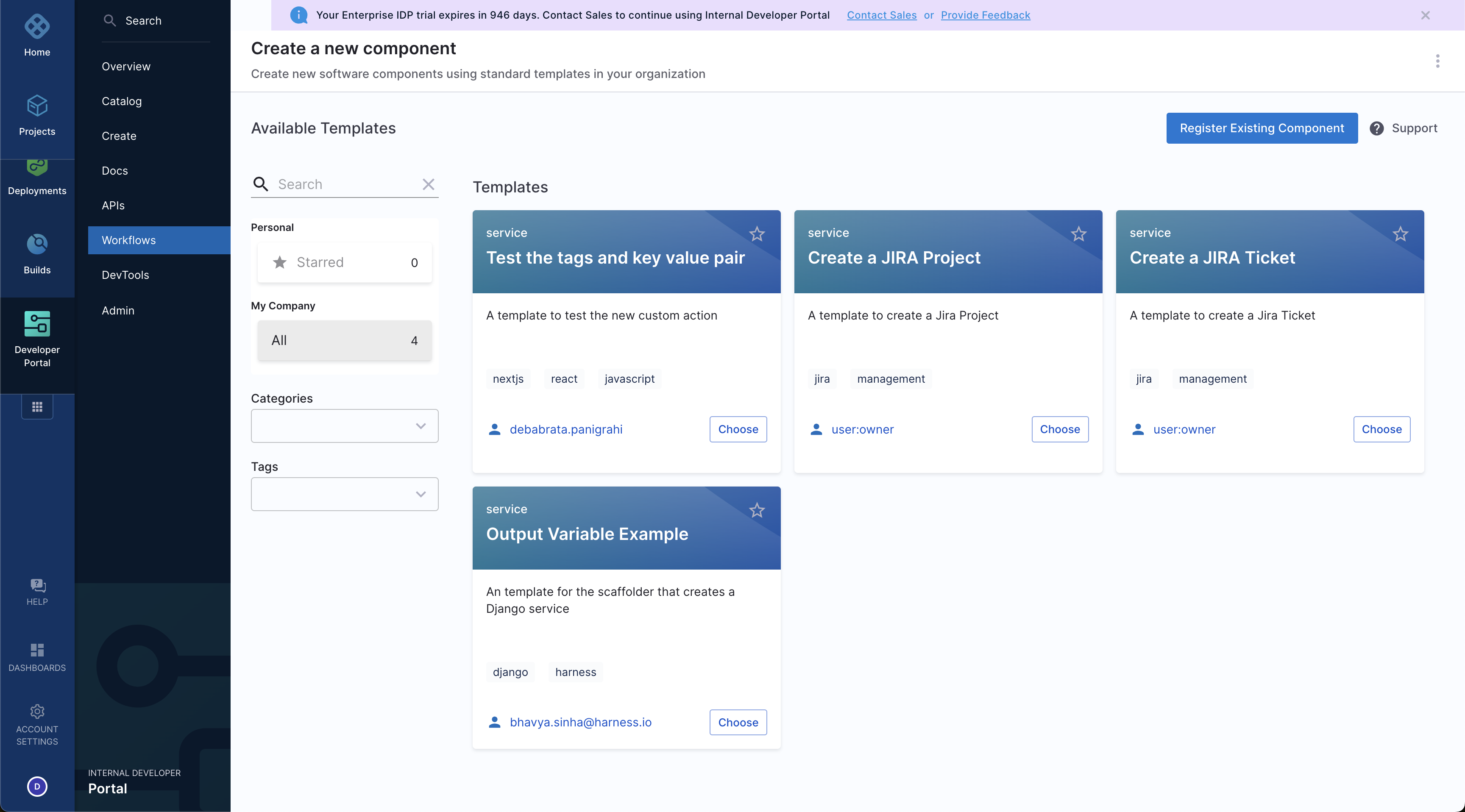 In this tutorial we will be creating Jira tickets using Workflows and add the information (i.e. ticket numbers) to the corresponding Software Component in the Catalog and display the same in the UI using Additional Info Card. The aim of this tutorial is to help you understand the usage of REST APIs to push information in the Catalog and then use them in different parts of IDP according to your use-cases.