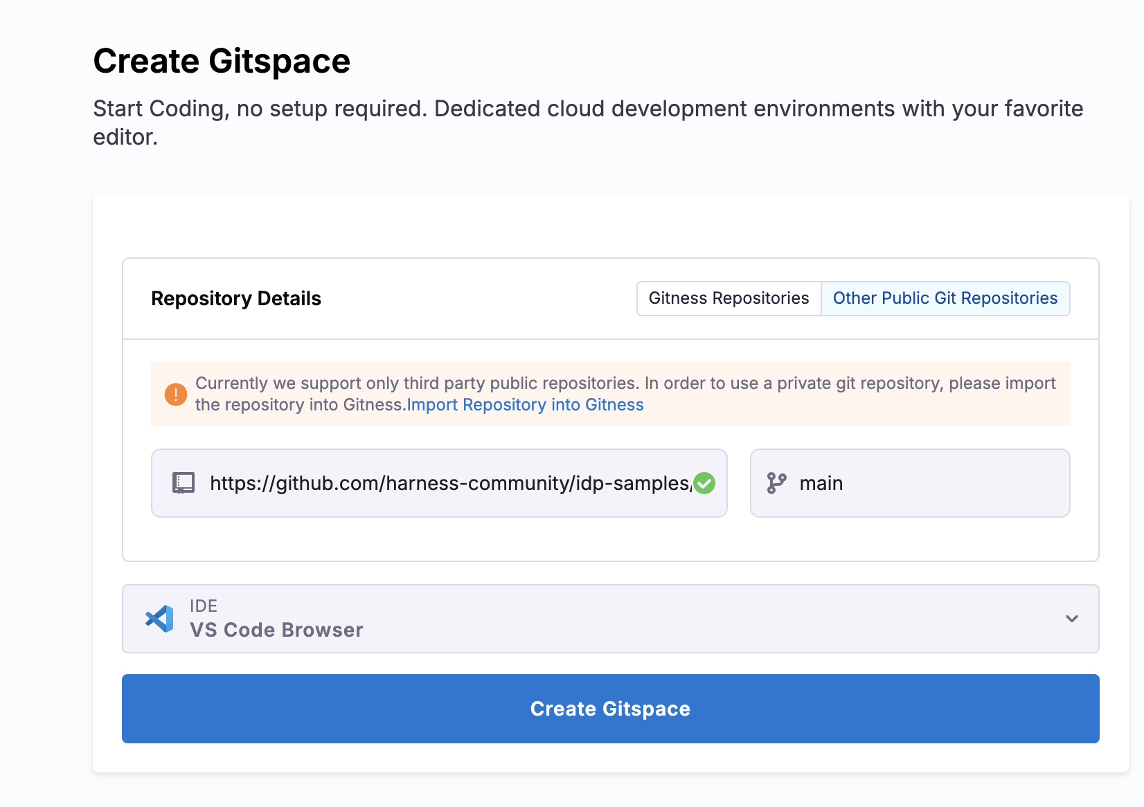 Now Create Gitspace, by selecting the default branch as