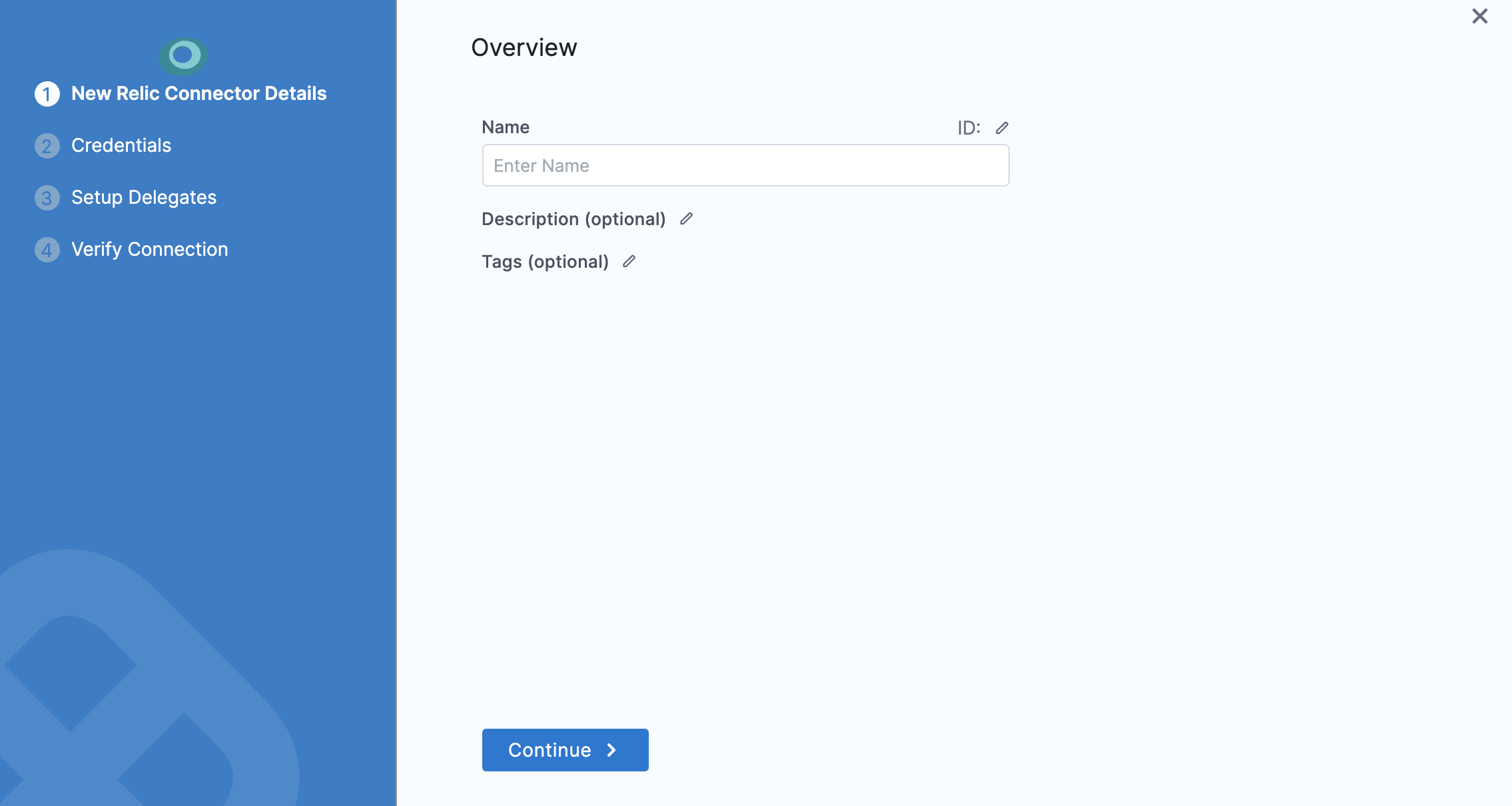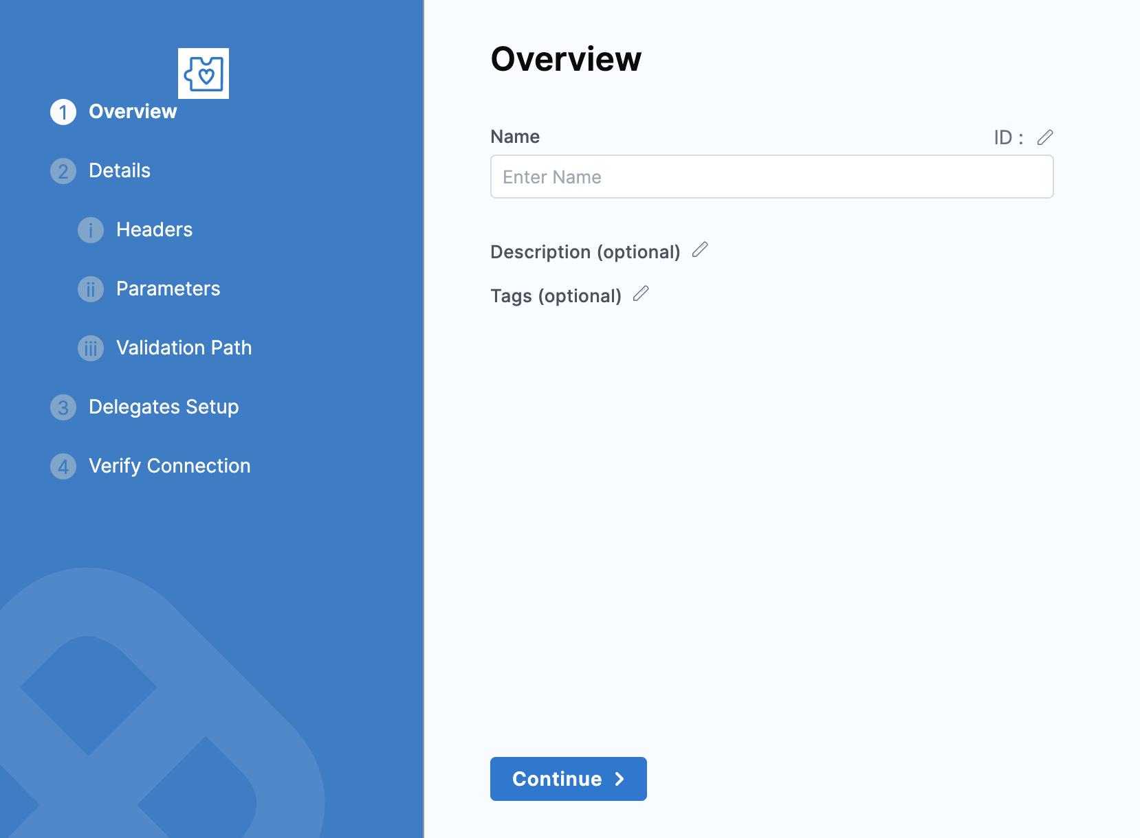 In the Overview tab, enter a name for the connector, an optional description, and a tag, and then select Continue. If you are going to use multiple providers of the same type, ensure you give each provider a different name.