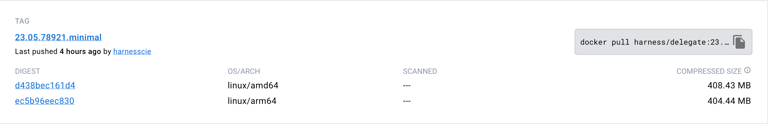 Harness Minimal Delegate Docker imageA minimal delegate image is available in Docker Hub at https://hub.docker.com/r/harness/delegate/tags.