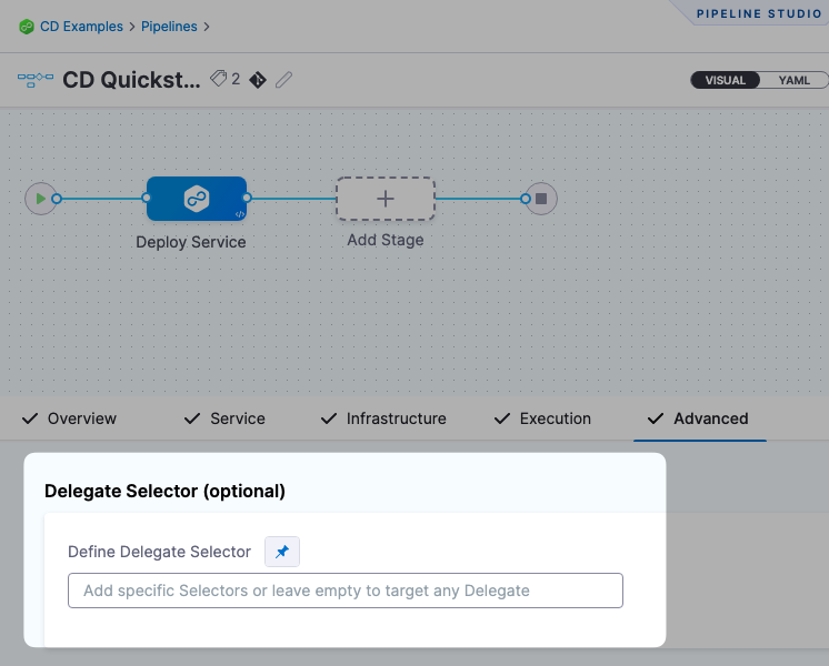 However, it is also possible to set a delegate at the step level using the Delegate Selectors advanced option. Choosing a selector in this method described above will override any previously selected delegate selector, including selections from the pipeline, stage, step group or infrastructure definition (via connector). This can lead to unexpected behavior.