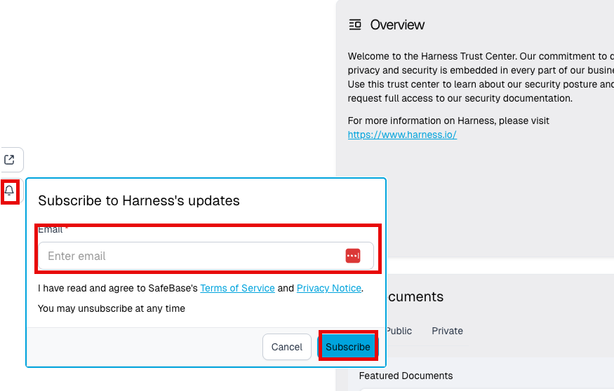 Harness provides a method to subscribe to all updates in the Harness Trust Center.
