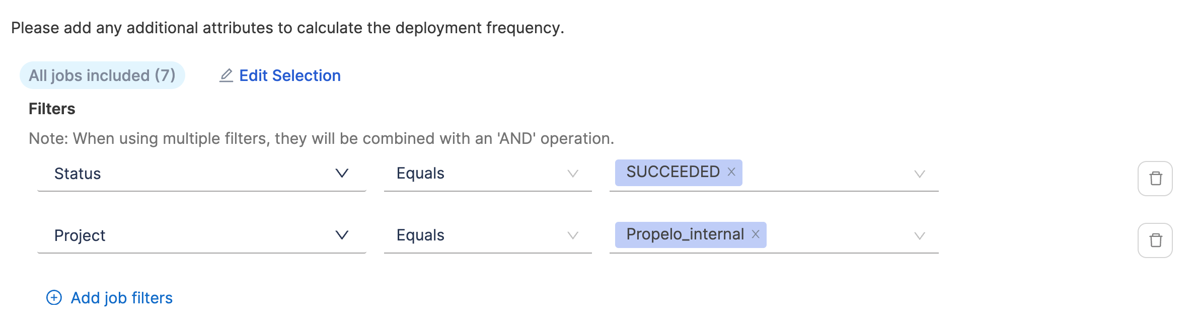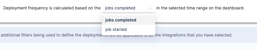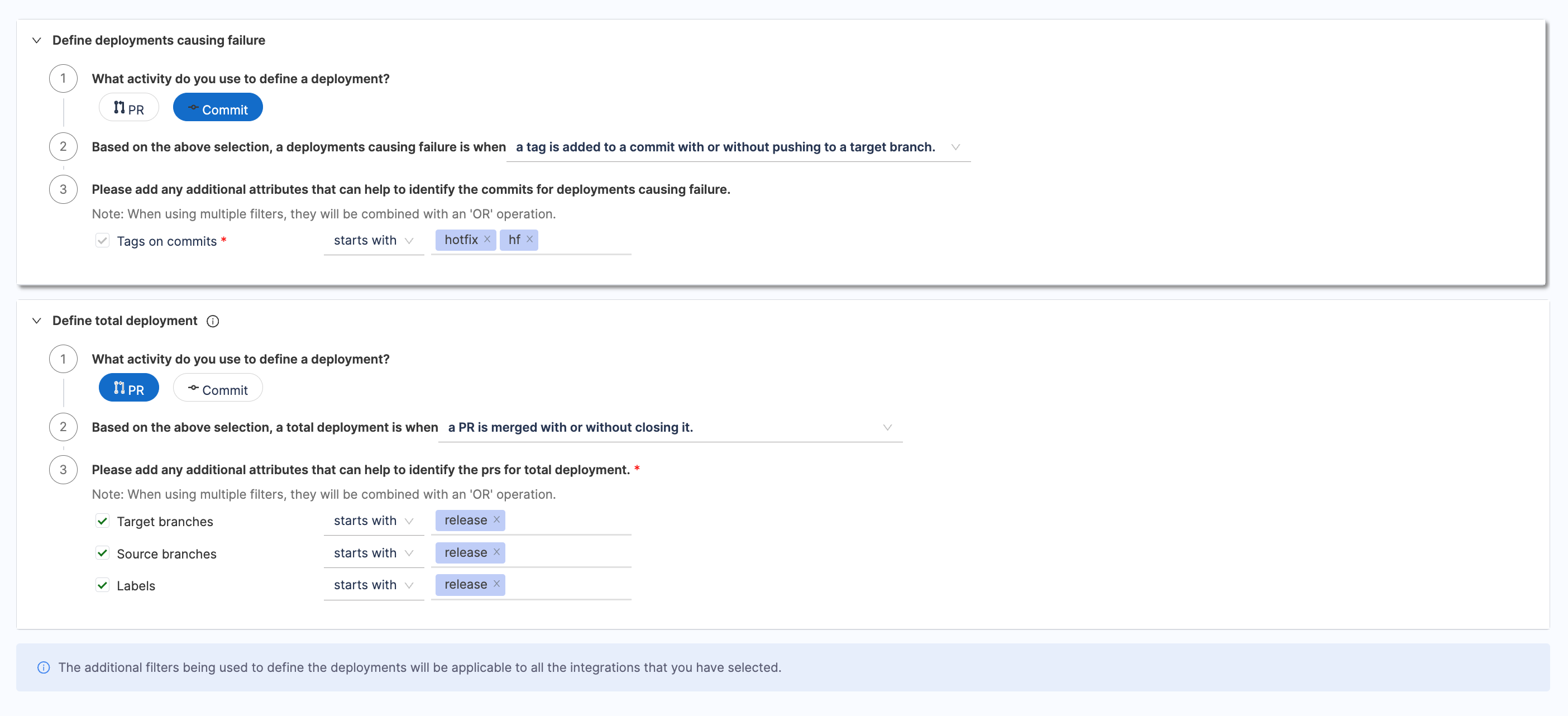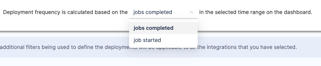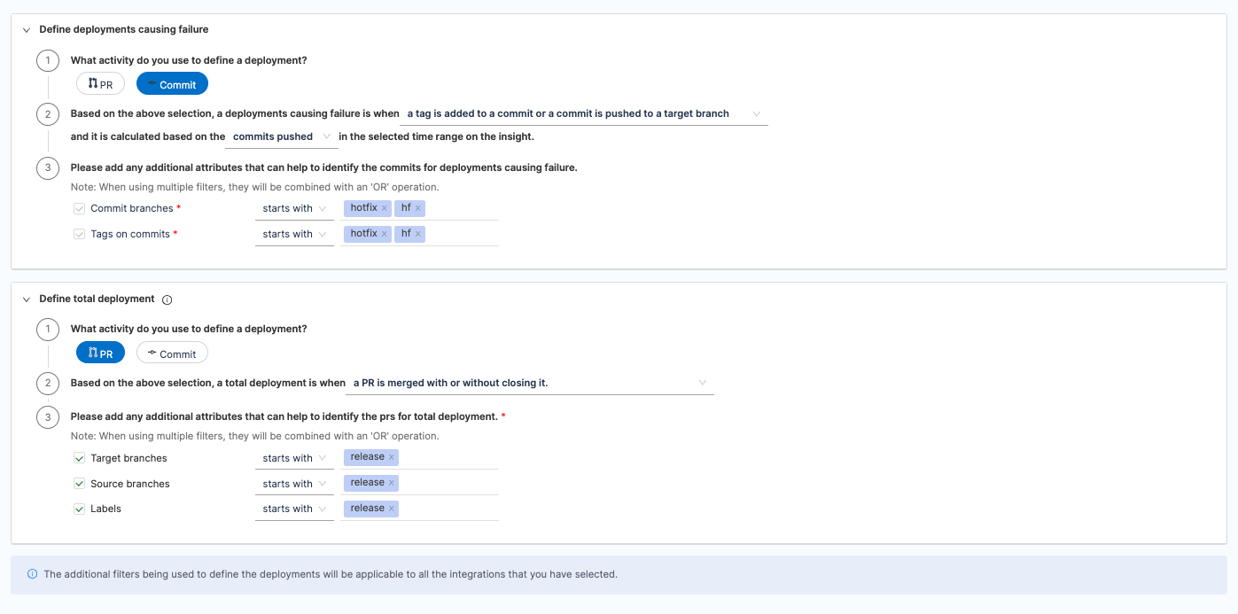 • Defind the settings for how you want to calculate deployment frequency. The additional filters being used to define the deployments will be applicable to all the integrations that you selected.