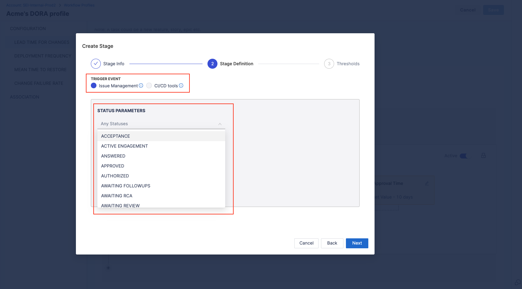 • Define the Stage Trigger Event (e.g., Issue Management) and map the stage to statuses in your issue management system.